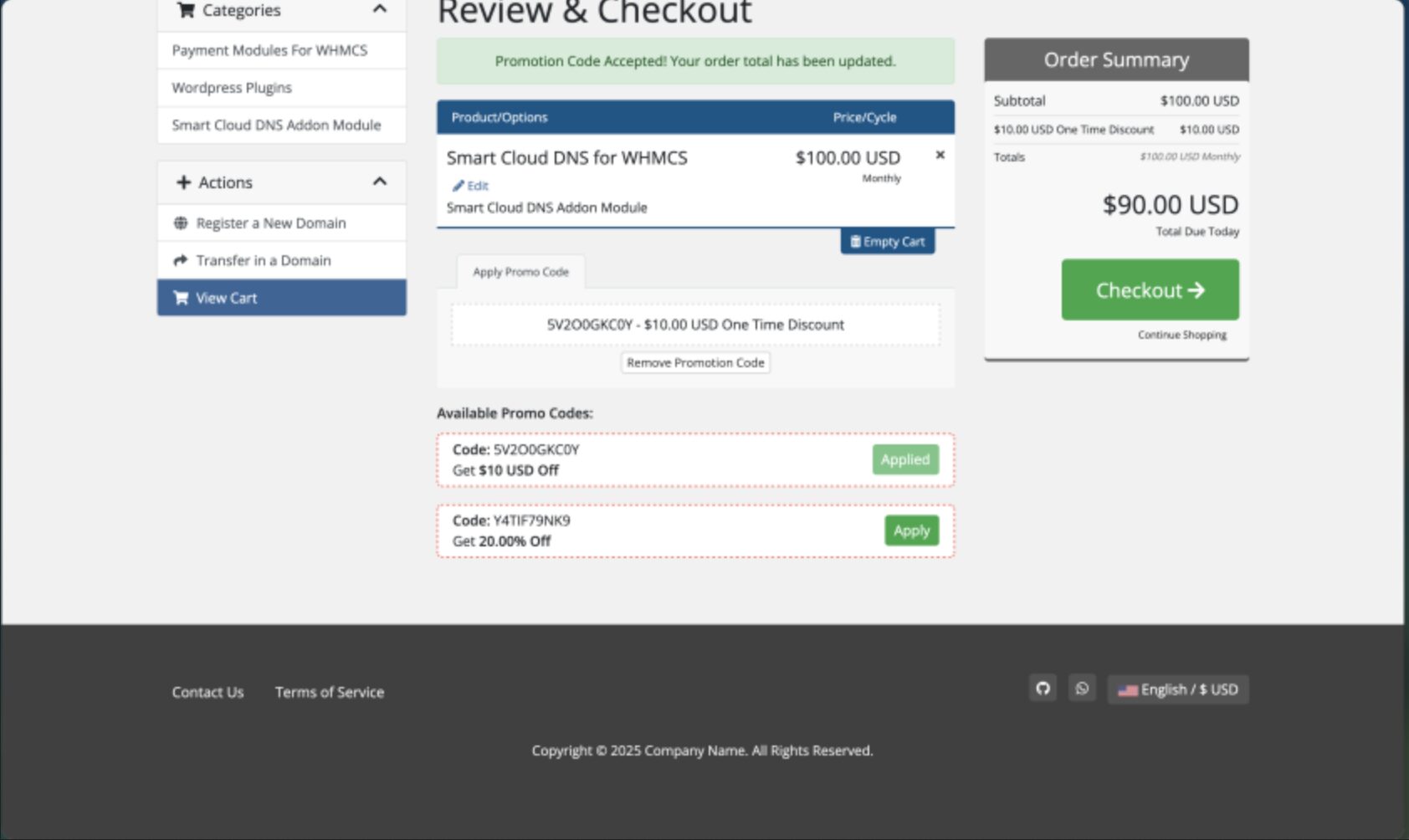 Displays available coupons directly on the cart page Customers can apply discounts instantly with one click Prevents users from leaving your website to search for coupon codes Works with existing WHMCS promotions and conditions Helps increase order completion rate and average revenue